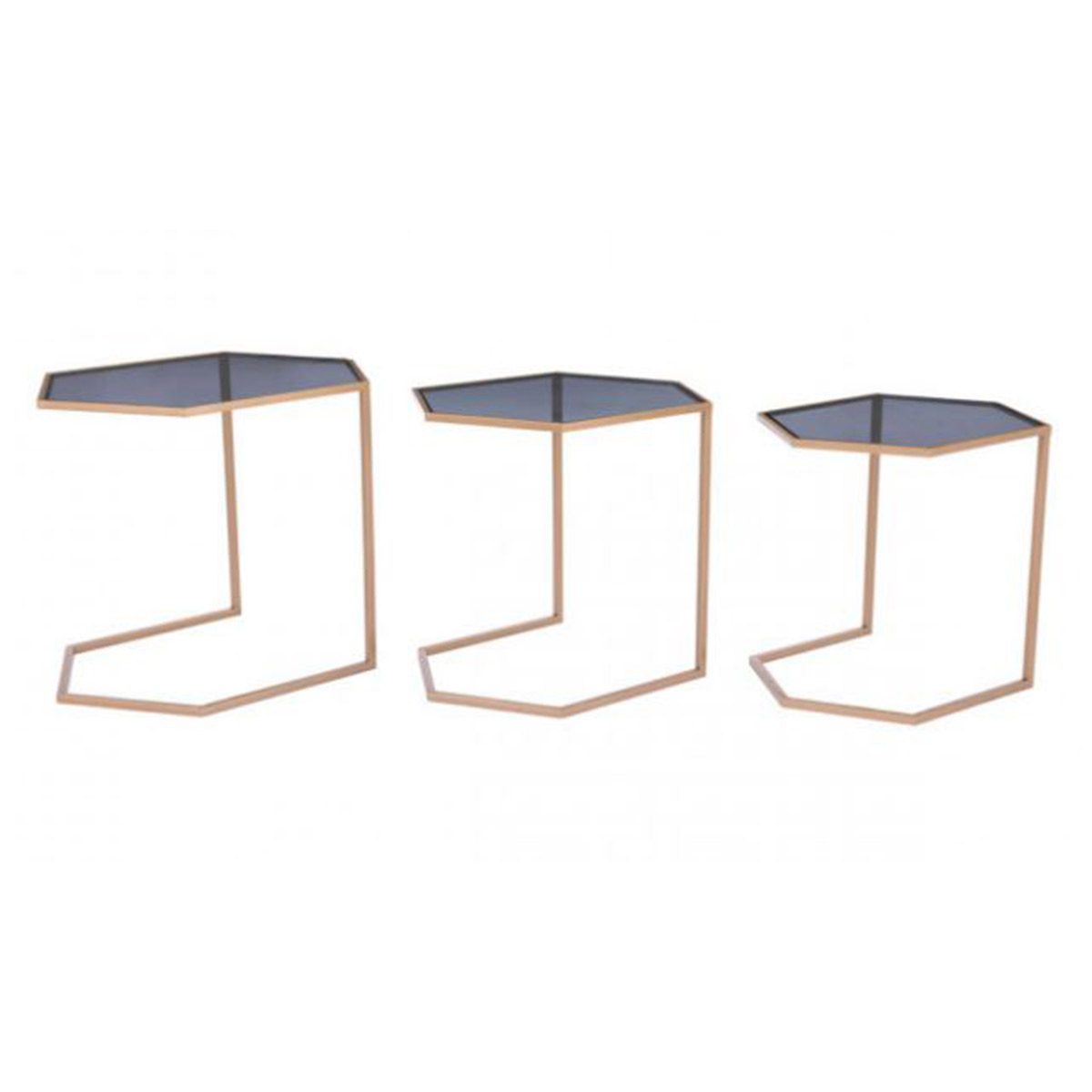 Gold framed angular nesting tables with smoky black glass; available in three sizes or as a trio.