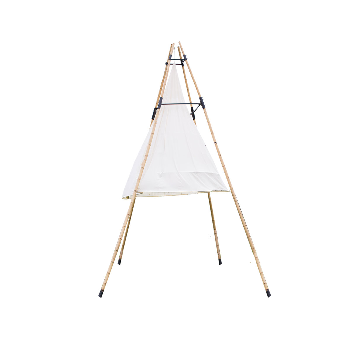 Bamboo framing with overhead floating canvas top. Requires height and load in clearance and scissor lift installation.