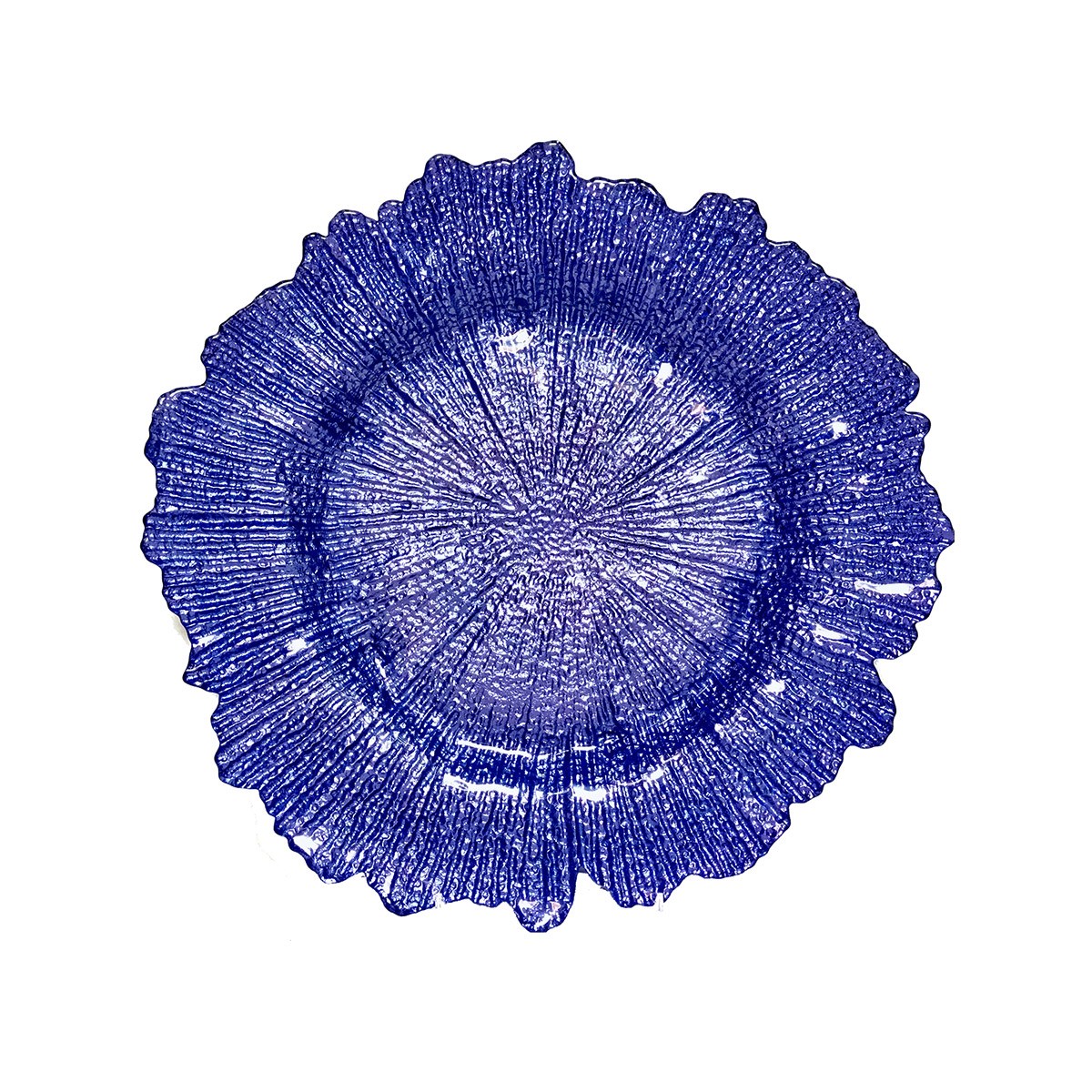 Glass charger plate with coral-reef inspired design. Subtle shimmer with high-gloss finish.