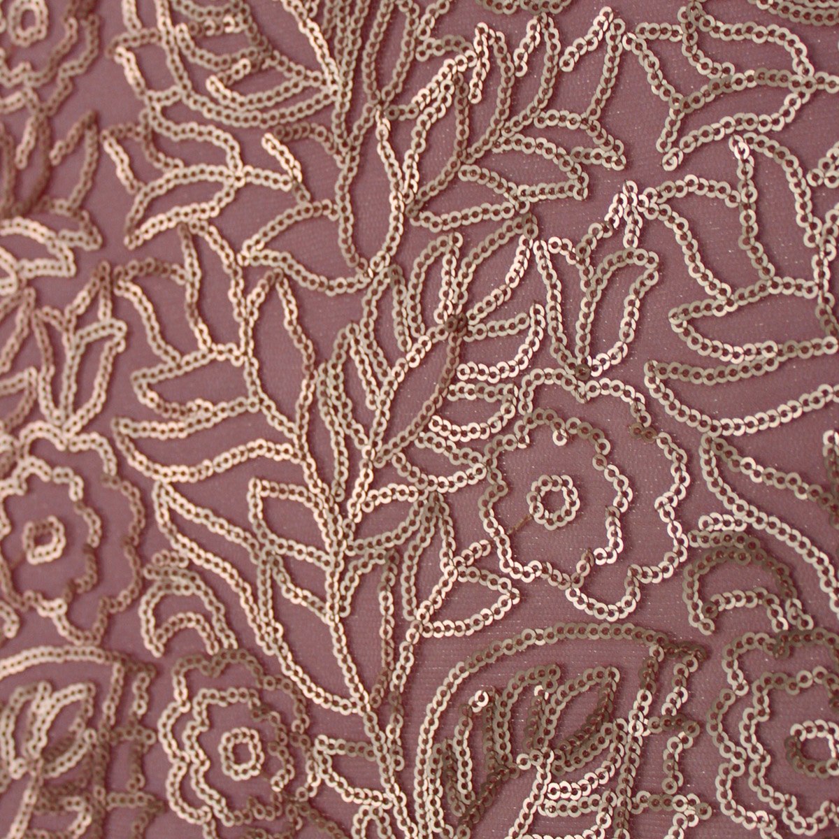 Sheer pale pink fabric with intricate botanical sequin pattern.