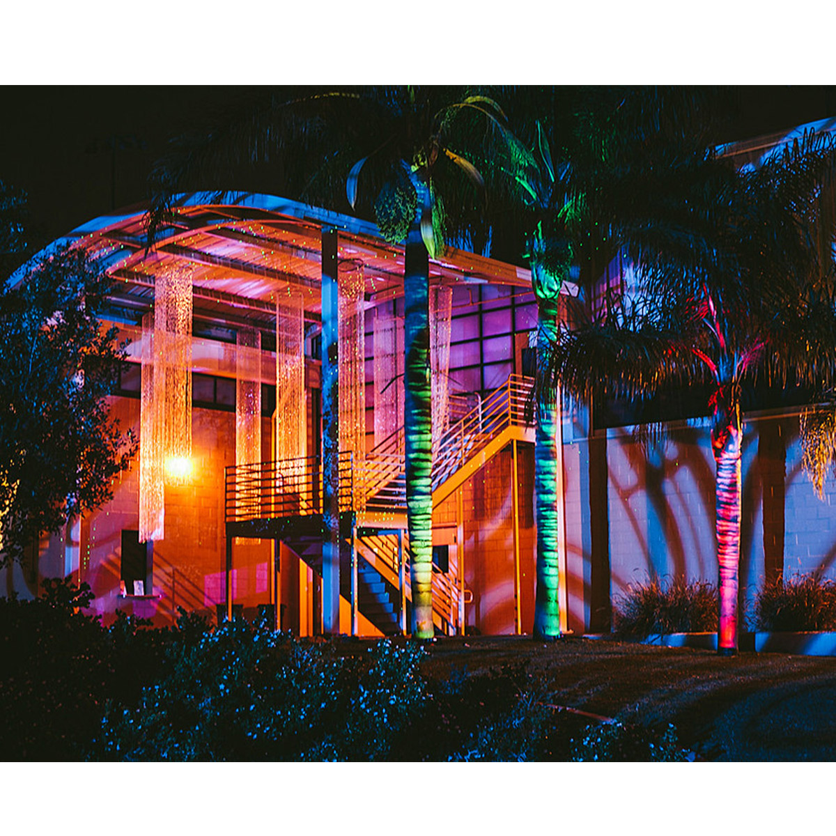 Acrylic crystal beaded strands. Can be suspended from the ceiling as a chandelier or rigged by a ground-supported pole and base up right system.