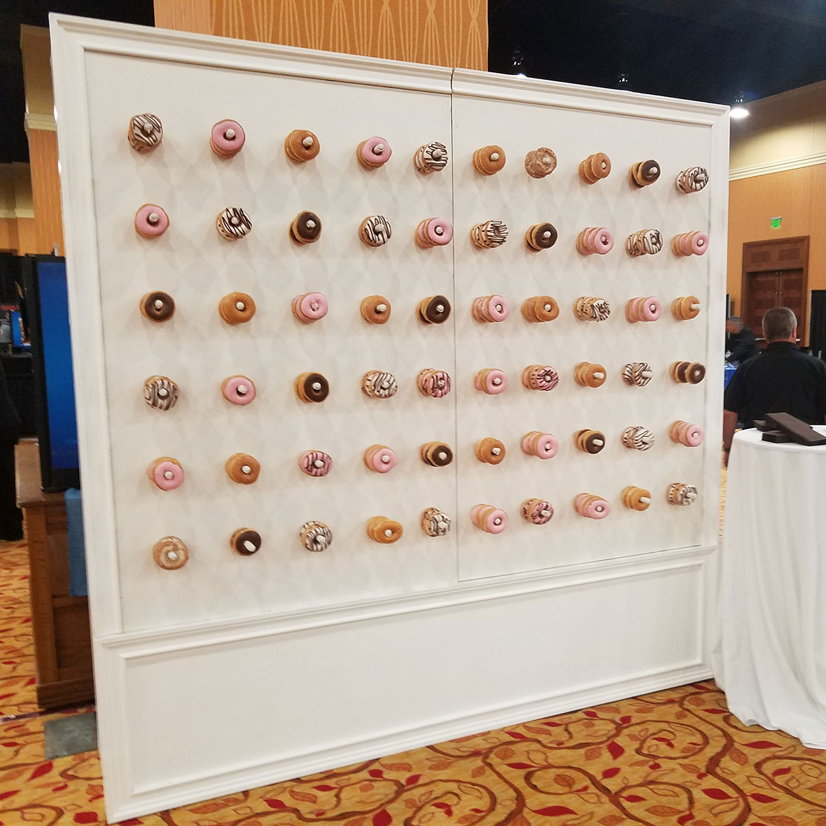 White peg wall with dowells to display food or décor. Use for donuts, pretzels, or any creative display!