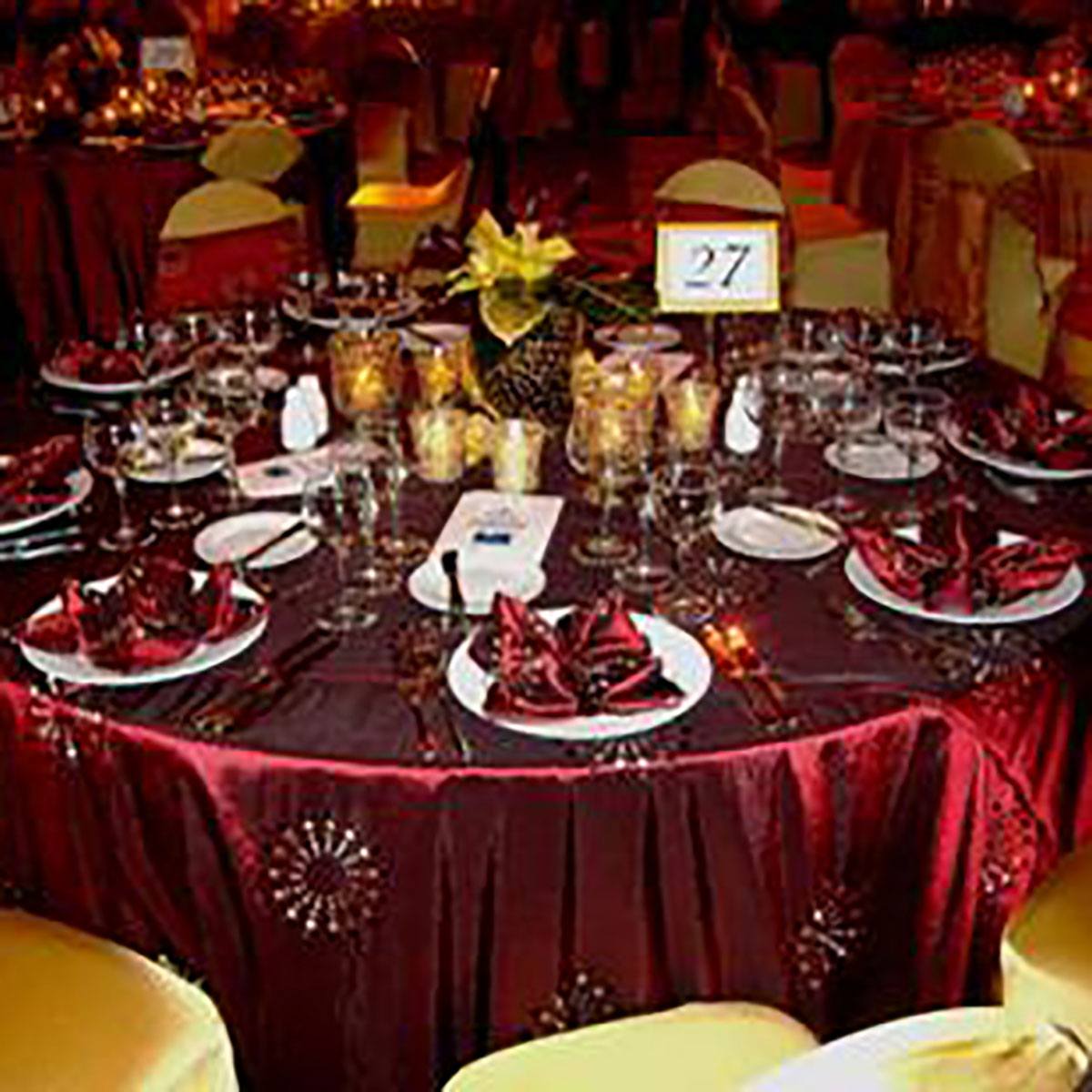 Rich burgundy colored taffeta embroidered with chocolate and ivory toned dots for a South American inspired design.