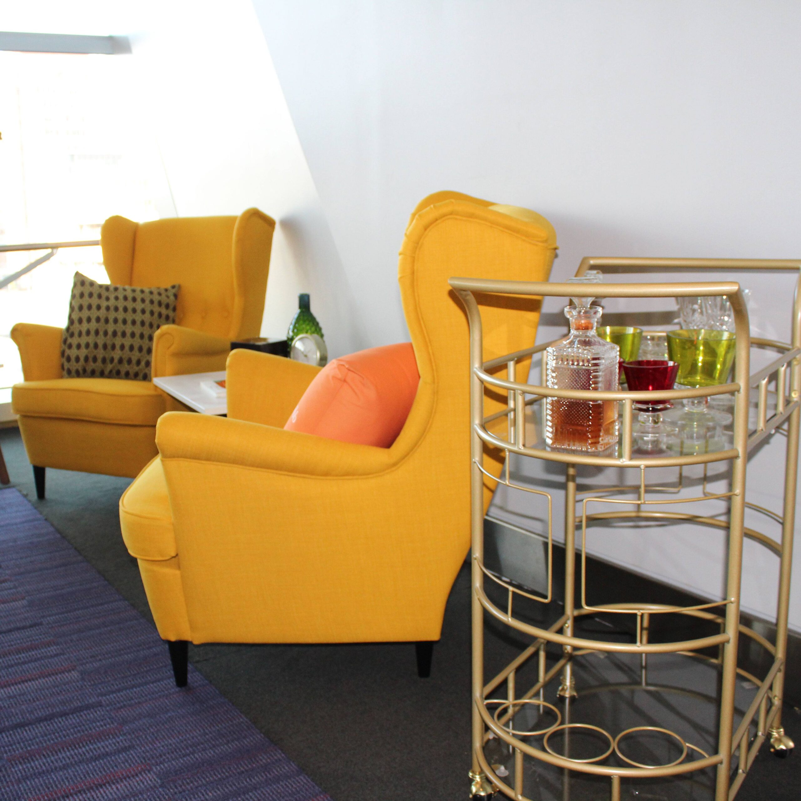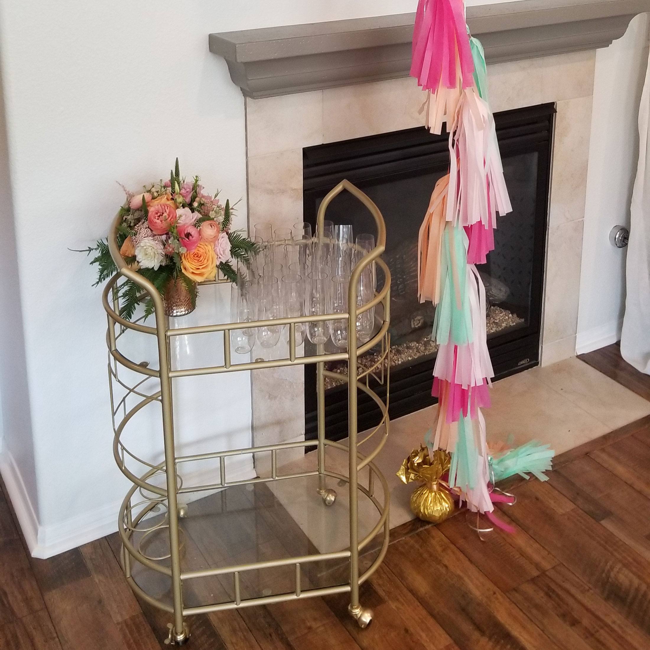 Gold metal and glass rolling bar cart.