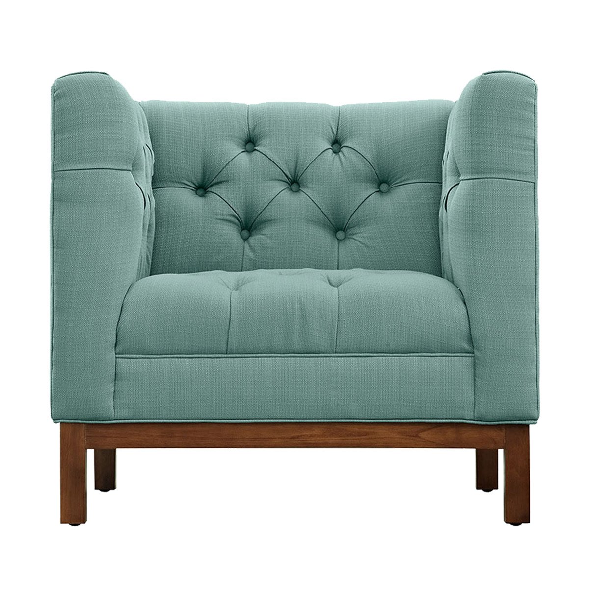 Tufted aqua fabric chair with Mid Century aesthetic.