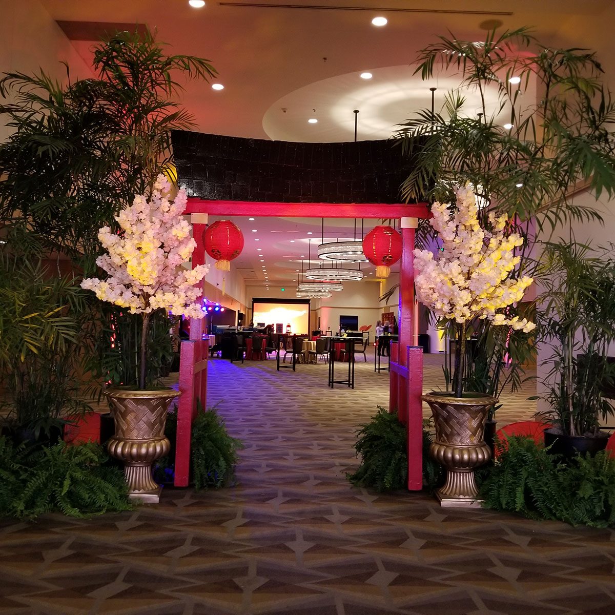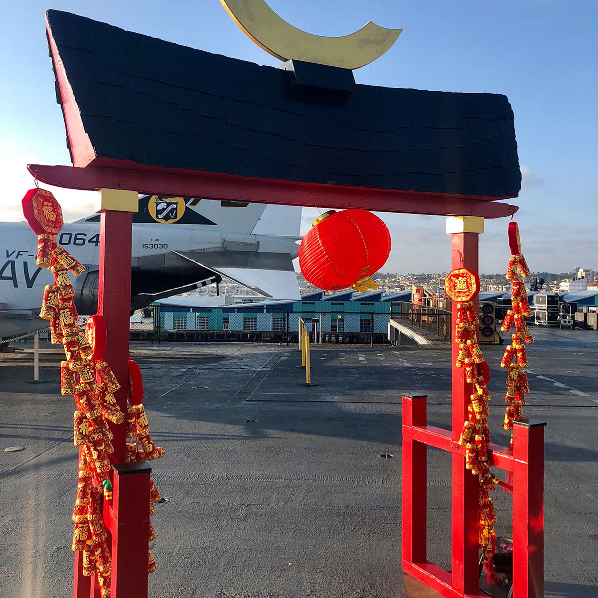 Pagoda-style arch with black top and red gate sides.
