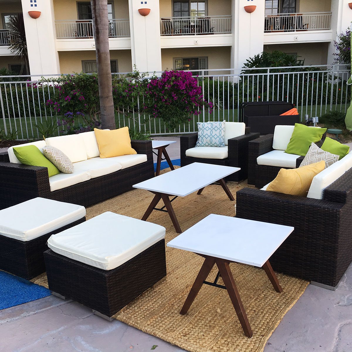 Outdoor style furniture. Woven faux-rattan ottoman with cushion.