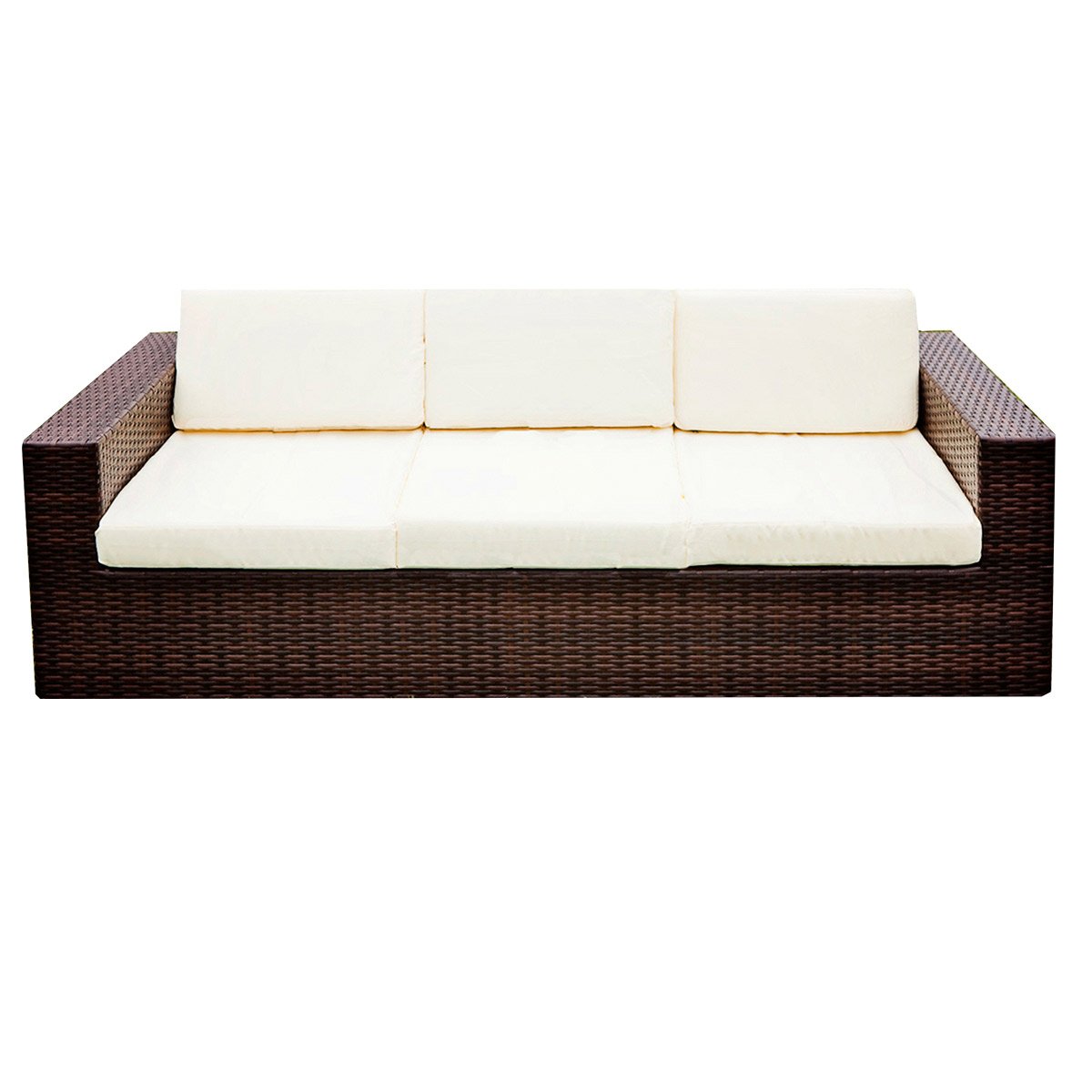Outdoor style furniture. Woven faux-rattan sofa with cushions.