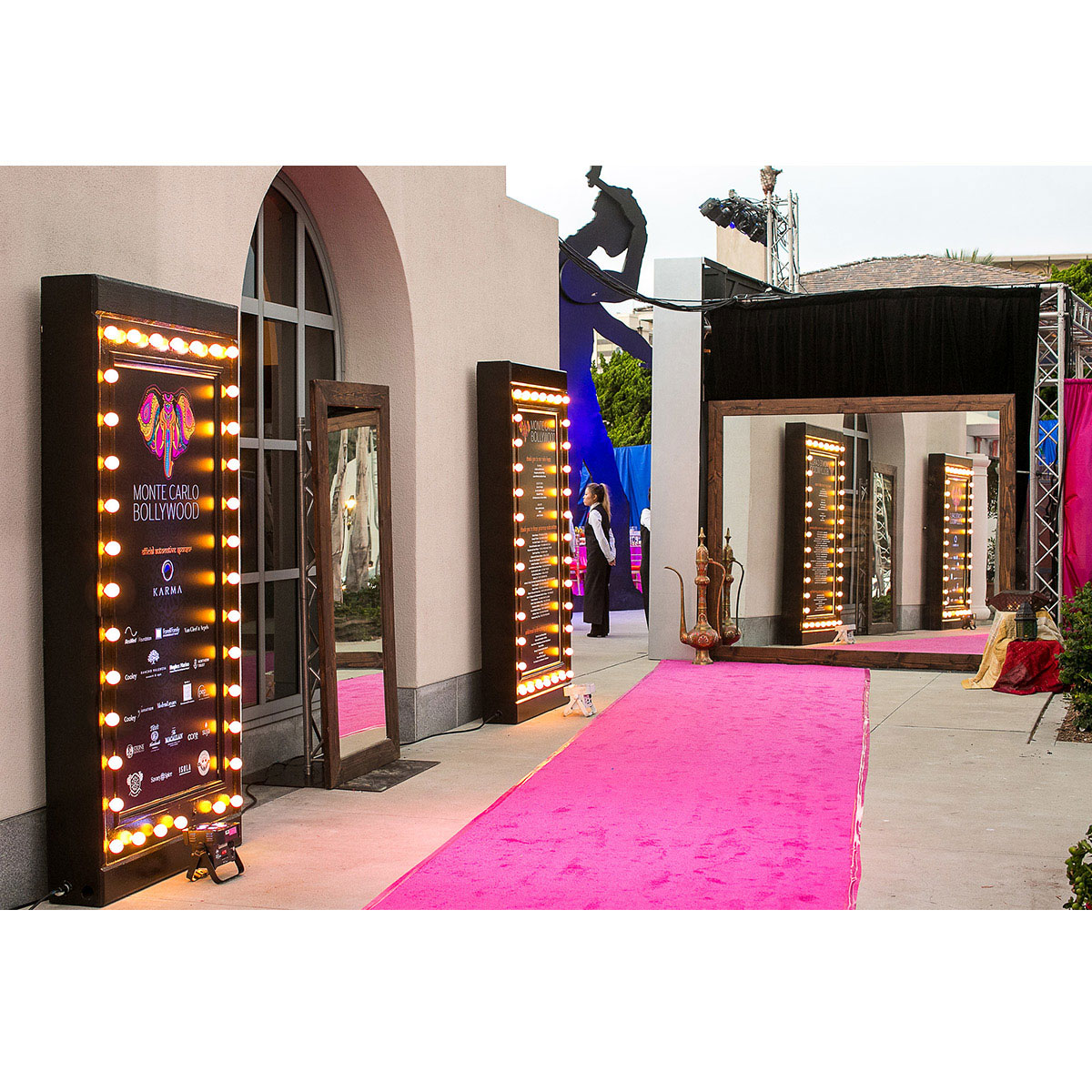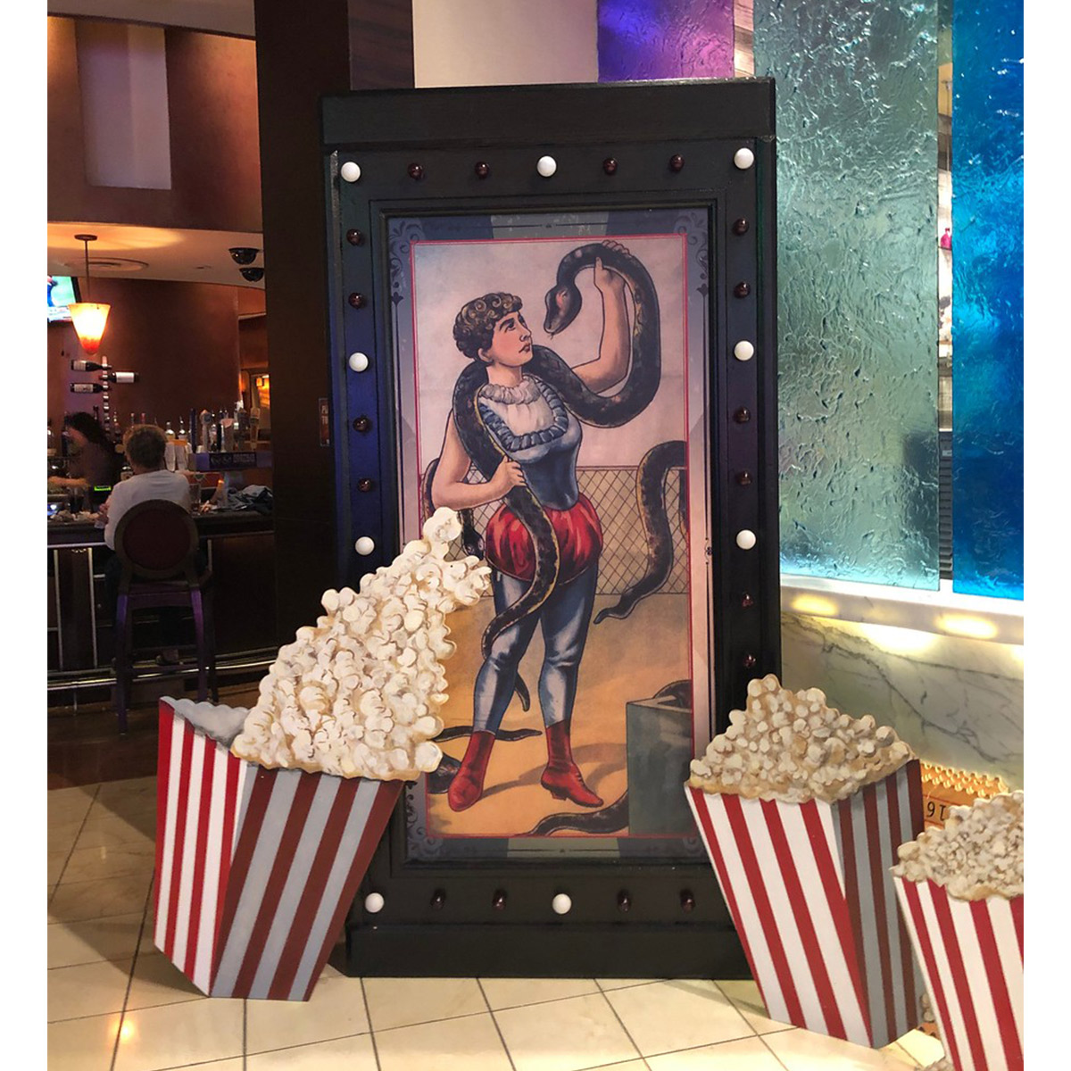 Large lighted marquee box; includes back lit panel plus rimmed with marquee bulbs. Self-standing. Customizable signage.