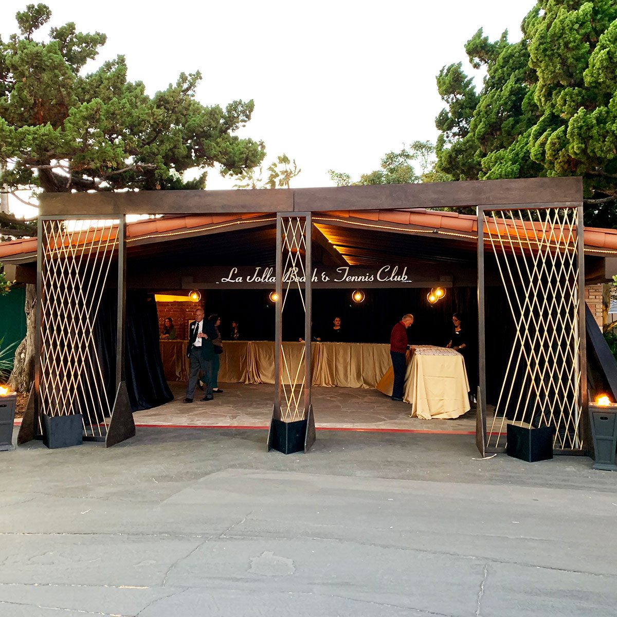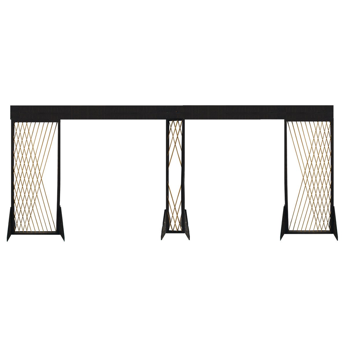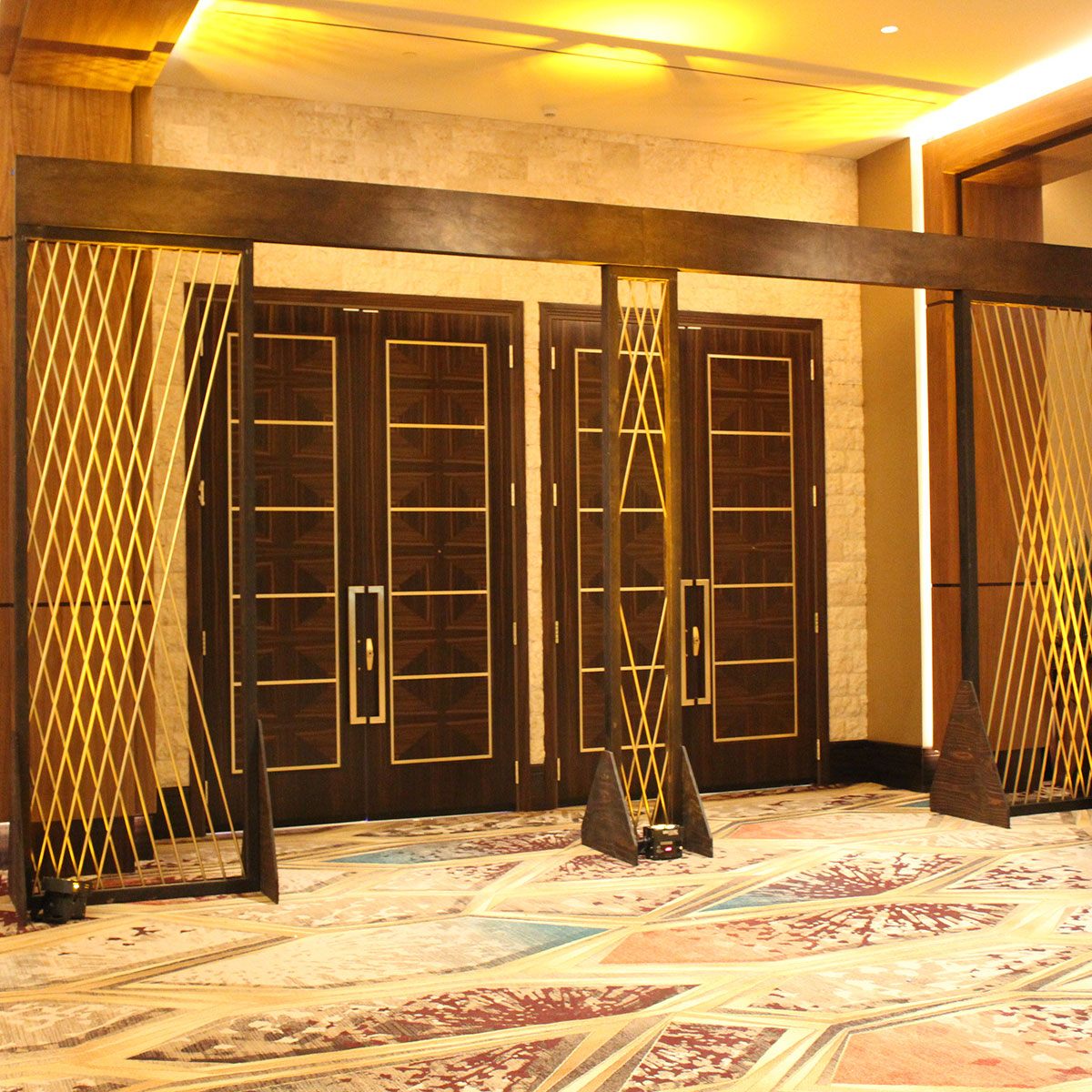 Entrance arch made from our Radiant Panels. Gold criss-cross tubing framed in an ebony colored wood.