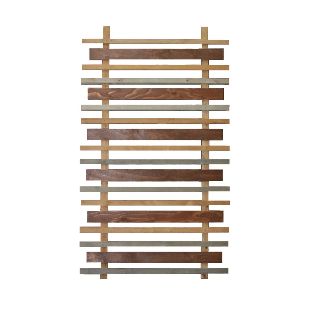 Varying width slat wall with multi-colored stains. Double sided with slats framing both sides of upright posts.