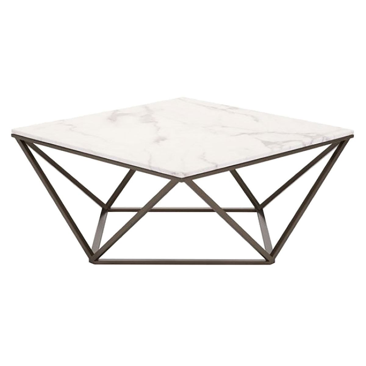 Angular metal coffee table with white faux marble top.