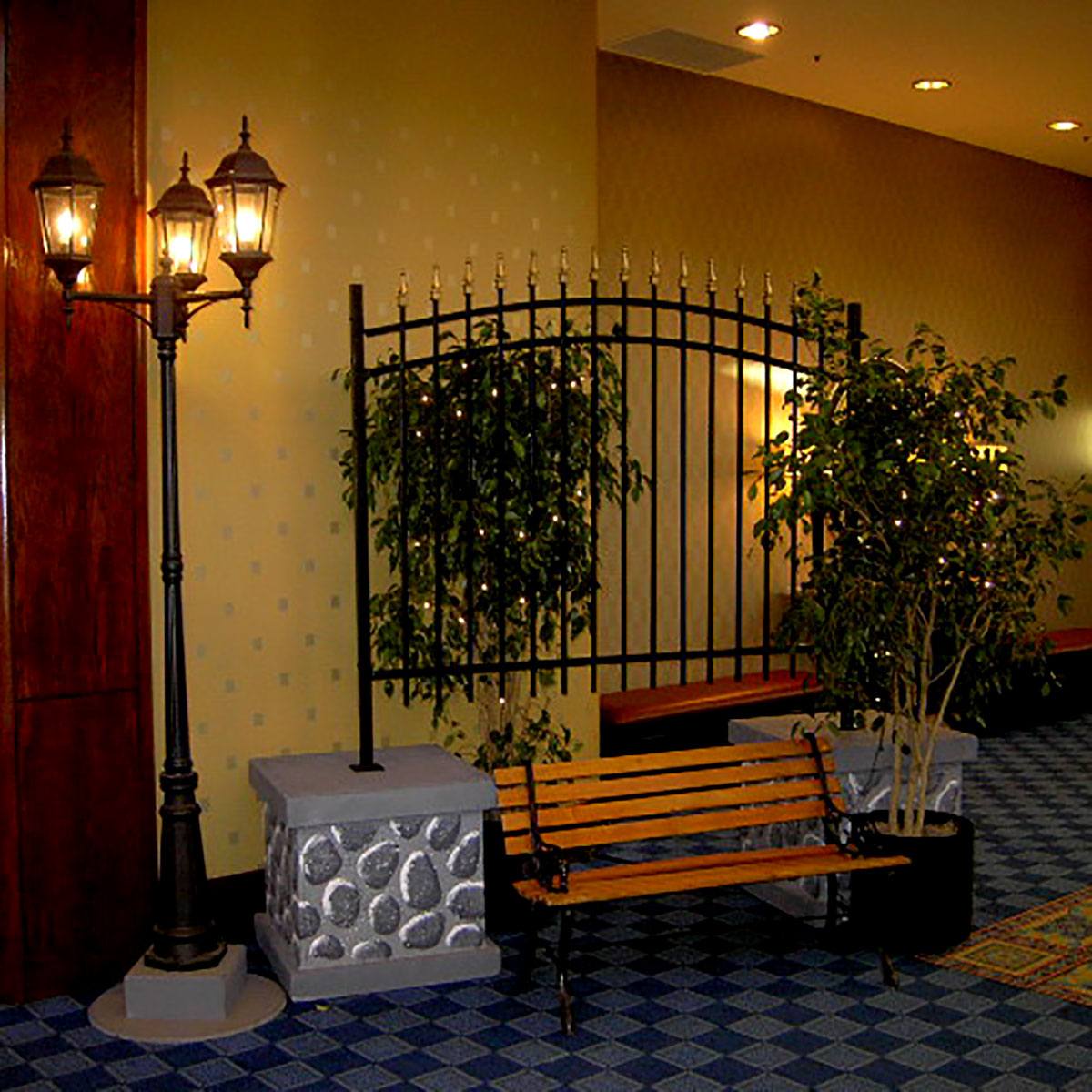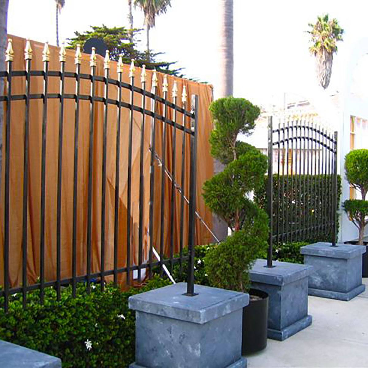 Wrought iron fence section with gray faux-stone painted box bases. Double sided.